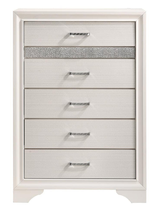 Sparkling diamond-like trim ups the glamour for a five-piece modern bedroom set. Compelling in its elegant simplicity, it centers on an upholstered...